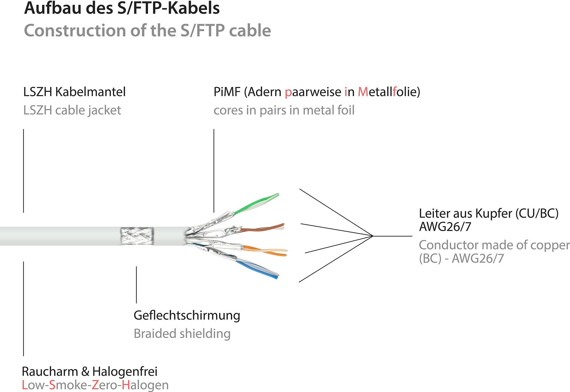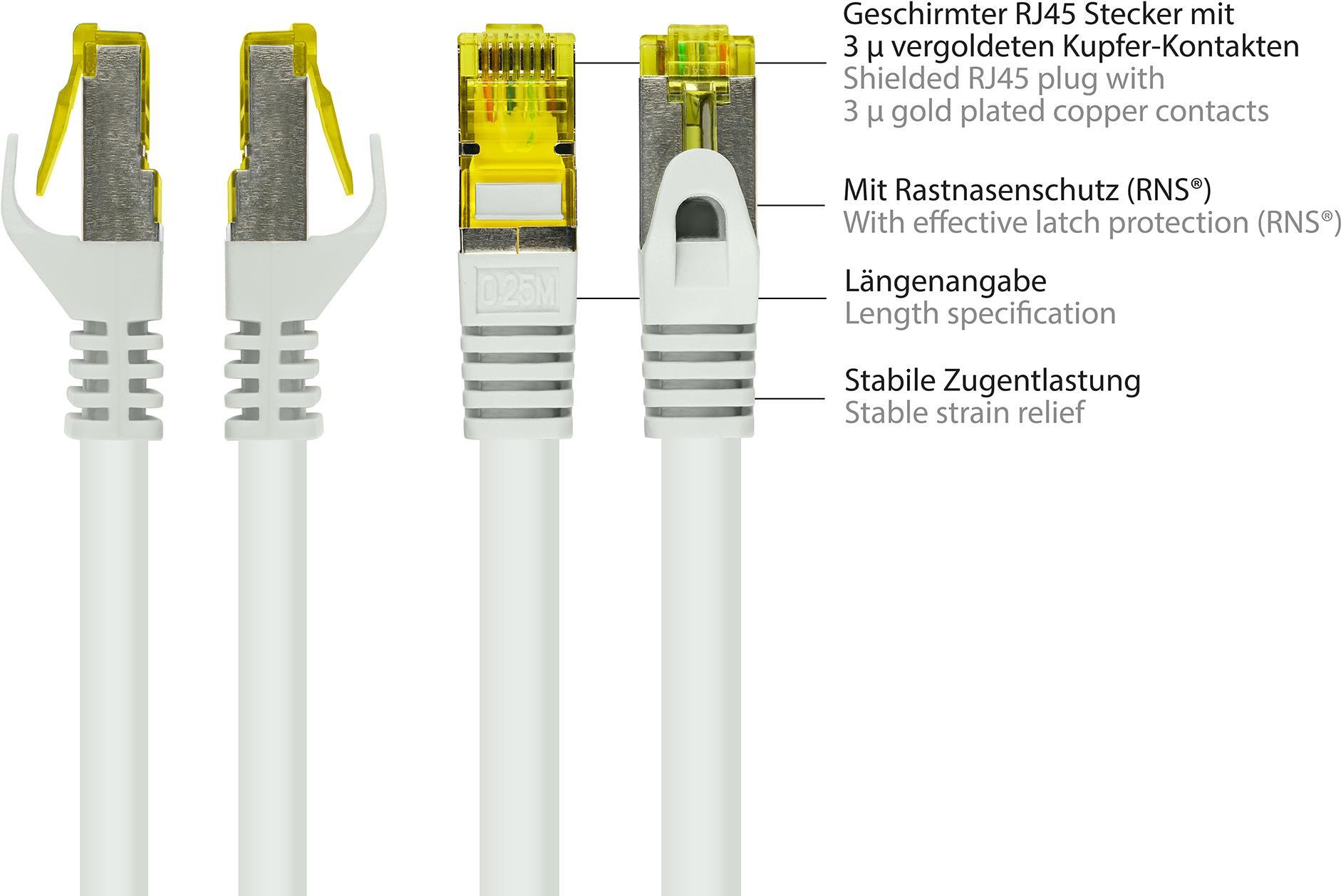RJ45 Patchkabel mitCat.7 Rohkabel und Rastnasenschutz (RNS®), S/FTP, PiMF, halogenfrei, 600MHz, OFC, weiß, 60m, Good Connections® (8070R-600W)