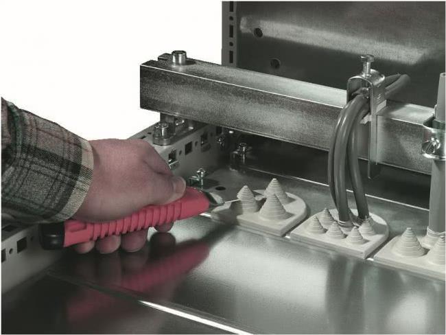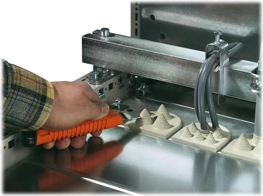 In Kombination mit dem Kabeleinführungsblech bieten die Kabeleinführungstüllen eine einfache und schnelle Abdichtung von im Bodenbereich der Schränke einzuführenden Kabeln. Sie sind für den Gebrauch mit 3-Kabel Tüllen (max. Durchmesser: 21 mm) bestimmt.