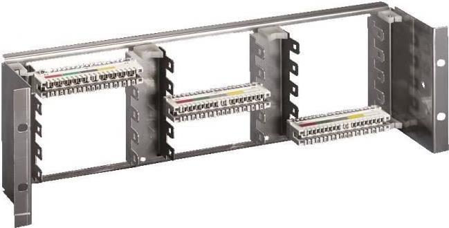 Die Trägereinheit ist für Aufnahme von maximal 15 LSA-Plus-Leisten à 10 DA. In der Trägereinheit aus Edelstahl lassen sich 3 x 5 LSA-Plus-Leisten waagrecht montieren. Die Montagefront liegt 100 mm hinter den 19"-Flanschen. Die 3 HE Trägereinheit kann in alle 482, 6 mm (19")-Befestigungsebenen integriert werden. Rangierbügel sorgen für ein geordnetes Führen und Verteilen der Fernmeldekabel.