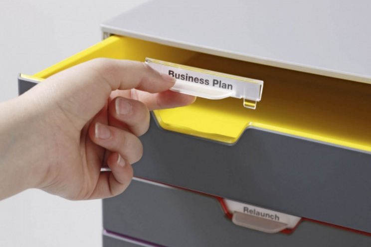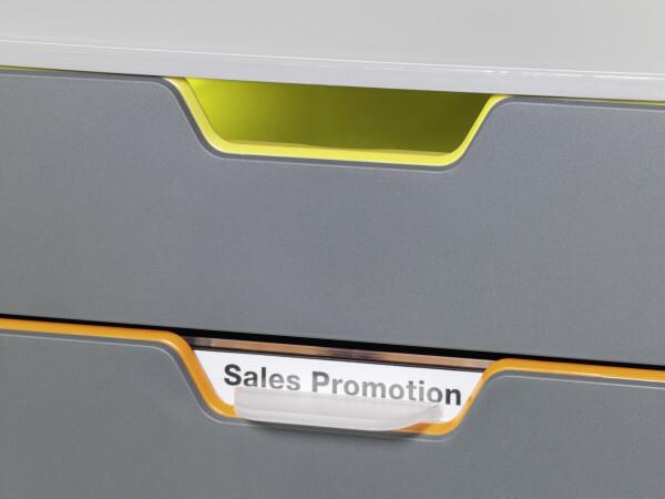 Die Schubladen können mit den beiliegenden transparenten Beschriftungsfenstern ausgestattet werden. Die computerbeschriftbaren Einsteck-Etiketten sind leicht auswechselbar.