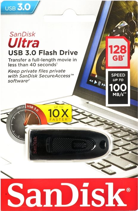 Mit dem ultraschnellen SanDisk Ultra USB 3.0 Flash-Laufwerk lassen sich Dateien bis zu zehnmal schneller übertagen als mit normalen USB 2.0-Laufwerken. Übertragen Sie einen vollständigen Spielfilm in unter 40 Sekunden - weniger warten, mehr genießen. Sie können Ihre Lieblingsmedien unbesorgt mit anderen Nutzern teilen, während der Passwortschutz der Software SanDisk SecureAccess Ihre privaten Dateien schützt. Dieses USB 3.0 Flash-Laufwerk ist abwärtskompatibel mit USB 2.0.