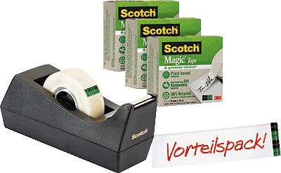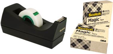 Zusammen mit dem Tischabroller erhalten Sie eine Rolle Scotch Magic Klebeband A greener choice. Die lösemittelfreie Klebebeschichtung auf pflanzlicher Basis, der Rollenkern aus 100 % recyceltem Karton und der Trägerfilm aus Naturfasern machen es zu einem umweltfreundlichen Klebeband. Es verfügt über exzellente Eigenschaften: unsichtbar auf weißem Papier, beschriftbar, schattenfrei kopierbar sowie leicht abzurollen.
