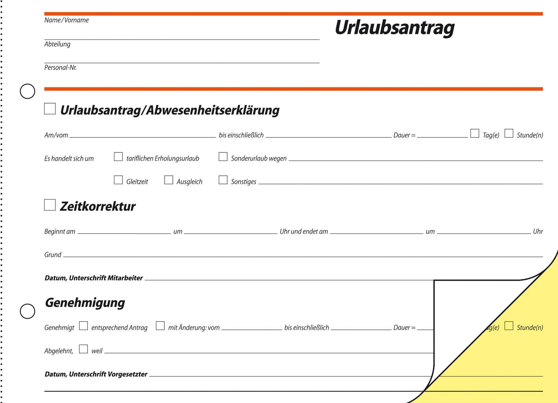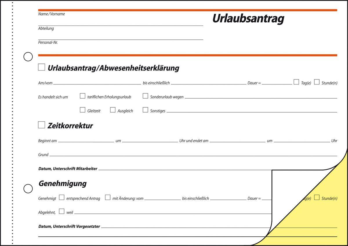 Selbstdurchschreibendes Formularbuch für die Beantragung von Urlaub im Format DIN A5 quer. Inhalt mit 40 Originalen + 40 gelben Kopien, inklusive integrierter Schreibunterlage. FSC zertifiziert, aktuell und rechtssicher. Alle Blätter mit Abheftlochung und ultrafeiner Microperforation für ein schnelles und sauberes Heraustrennen. Eine Sicherheitsbindung macht das Formularbuch besonders stabil und haltbar.