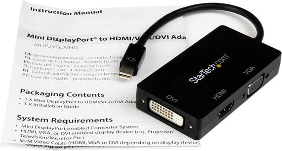 | Produktbeschreibung | StarTech.com 7,60cm (3") 1 Mini DisplayPort Adapter - 1080p - Mini DP / Thunderbolt to HDMI / VGA / DVI Splitter for Your Monitor (MDP2VGDVHD) - Videoadapter - Mini DisplayPort / HDMI / DVI / VGA - 27 cm |
