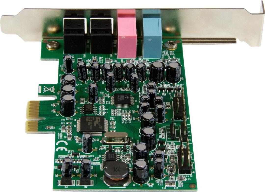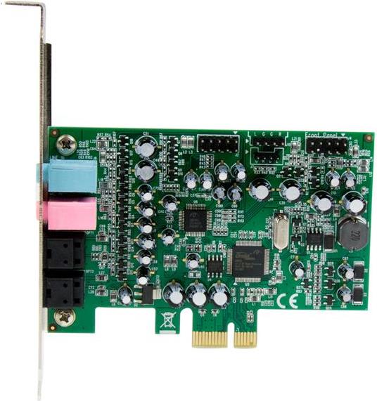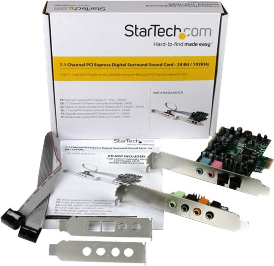 Mit dieser 7.1-Kanal-PCIe-Soundkarte können Sie ein hochwertiges Heimkino-Soundsystem schaffen. Sie bietet SPDIF-Eingang und Ausgang für kristallklares, digitales optisches Audio für das ultimative Hörerlebnis. Vielseitige Leistung Die vielseitige Soundkarte kann mit einer Vielzahl von Audio-Geräten verwendet werden Und dank des digitalen, optischen oder 3,5-mm-SPDIF-Analogausgangs brauchen Sie sich keine Sorgen über die Verbindungsmöglichkeiten Ihres Geräts machen. Sie können Ihrem optischen Receiver oder DAC digitales Audio oder dem Soundsystem analoges Audio ausgeben. Mit bis zu 24-Bit- und 192-KHz-Wiedergabe und -Aufnahme bietet diese 7.1-Surround-Soundadapterkarte High-Definition-Audio für hervorragende Soundqualität. Einfache Installation Anders als bei typischen Soundkarten wurde dieser Karte für kompakte Computer konzipiert, sodass sie ideal für Heimkino-PCs (HTPCs) geeignet ist. Sie umfasst die verschiedenen Anschlüsse auf einer Hauptkarte und eine innovative separate Header-Halterung. Dieser Karte wurde mit Standard Profil-Slotblechen konfiguriert und wird mit Low Profile (Halbhöhen)-Halterung geliefert. Die 7.1-Kanal-Surround-Soundkarte ist leicht zu installieren. Sie ist hervorragend geeignet für alle, die eine einfache Lösung zum Aufrüsten Ihres Hörerlebnisses suchen, z. B. Musikliebhaber oder Mischprofis. Mehrere Eingangsoptionen Für zusätzliche Skalierbarkeit können Sie ganz schnell ein Mikrofon oder anderes Aufnahmegerät über zwei 3,5-mm-Stereo- oder digitale SPDIF-Audio-Eingänge anschließen. Die PEXSOUND7CH wird mit einer 2-jährigen StarTech.com-Garantie sowie lebenslanger kostenloser technischer Unterstützung geliefert.