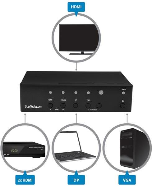 StarTech.com Multi-Input to HDMI Converter Switch - 2x HDMI + VGA + DP - 4K - Video/Audio-Schalter - Desktop (HDVGADP2HD)