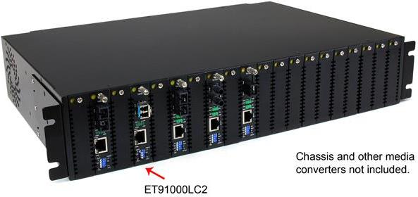 Für zusätzliche Vielseitigkeit unterstützt dieser Faseroptik-Medienkonverter den eigenständigen Betrieb oder die Installation in das 2U-Rackmount-Gehäuse mit 20 Einschüben (ETCHS2U) oder einen austauschbaren SFP-Steckplatz.