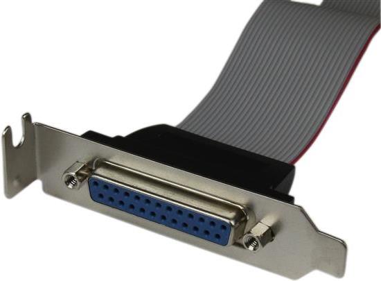 Die DB25-auf-IDC26-Parallelport-Halterung PLATE25F16LP fügt an der Rückseite eines Low Profile-Computers/kompakten Computers einen DB25-Parallelport hinzu, der an einem IDC26-Header-Anschluss an der Hauptplatine angeschlossen werden kann.