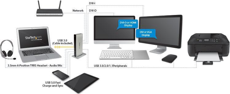 | Produktbeschreibung | StarTech.com USB 3.0 Dockingstation - kompatibel mit Windows / macOS - Dual DVI Monitor - mit DVI auf HDMI und VAG Adapter - Dockingstation - USB - DVI - 1GbE |