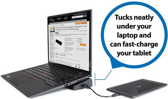 Diese TAA-konforme USB-3.0-Dockingstation für zwei Monitore kombiniert einen USB-3.0-Hub mit 4 Anschlüssen, Kopfhörer- und Mikrofon-Audioanschlüsse, einen USB-Schnellladeanschluss und einen GbE-RJ45-Anschluss mit Wake-on-LAN (WOL).