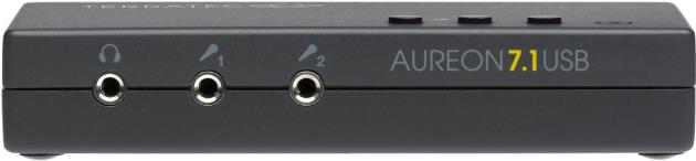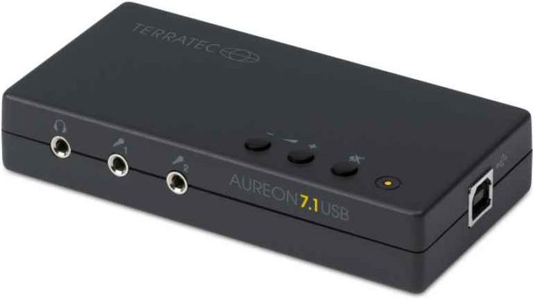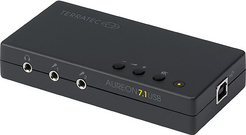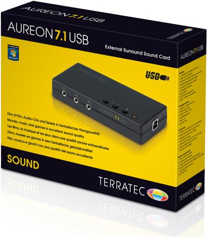 Ob Film-DVD oder Super-Audio-CD: Der Surround-Sound gehört inzwischen zum guten Ton im Multimediabereich. Wer diesen von seinem PC in bester Qualität genießen will, ist bei der neuen Aureon 7.1 USB genau richtig.Der Nachfolger des Megasellers Aureon 5.1 USB macht schon vom Design her eine gute Figur: Mit mattschwarzem Gehäuse ist die USB-Soundkarte von zeitloser Eleganz und findet mit gerade einmal 12 x 6 cm auf wirklich jedem Schreibtisch Platz. Neben den Anschlüssen für die drei Boxenpaare, den Subwoofer und den Center-Speaker haben die Spezialisten für guten Sound von Terratec der Aureon 7.1 USB auch einen digitalen I/O zur Ausgabe der Mehrkanalformate AC3 und DTS spendiert. Zwei Buchsen für Mikrofone und ein Line-In komplettieren die Anschlussvielfalt.Für die schnelle Kommunikation mit dem Rechner sorgt das USB Interface, für die bequeme Handhabung sind zwei Lautstärkeregler und ein Mute-Button zuständig.Fazit: Für kleines Geld gibt es die gewohnt hohe Terratec-Qualität für alle Multimediafans.
