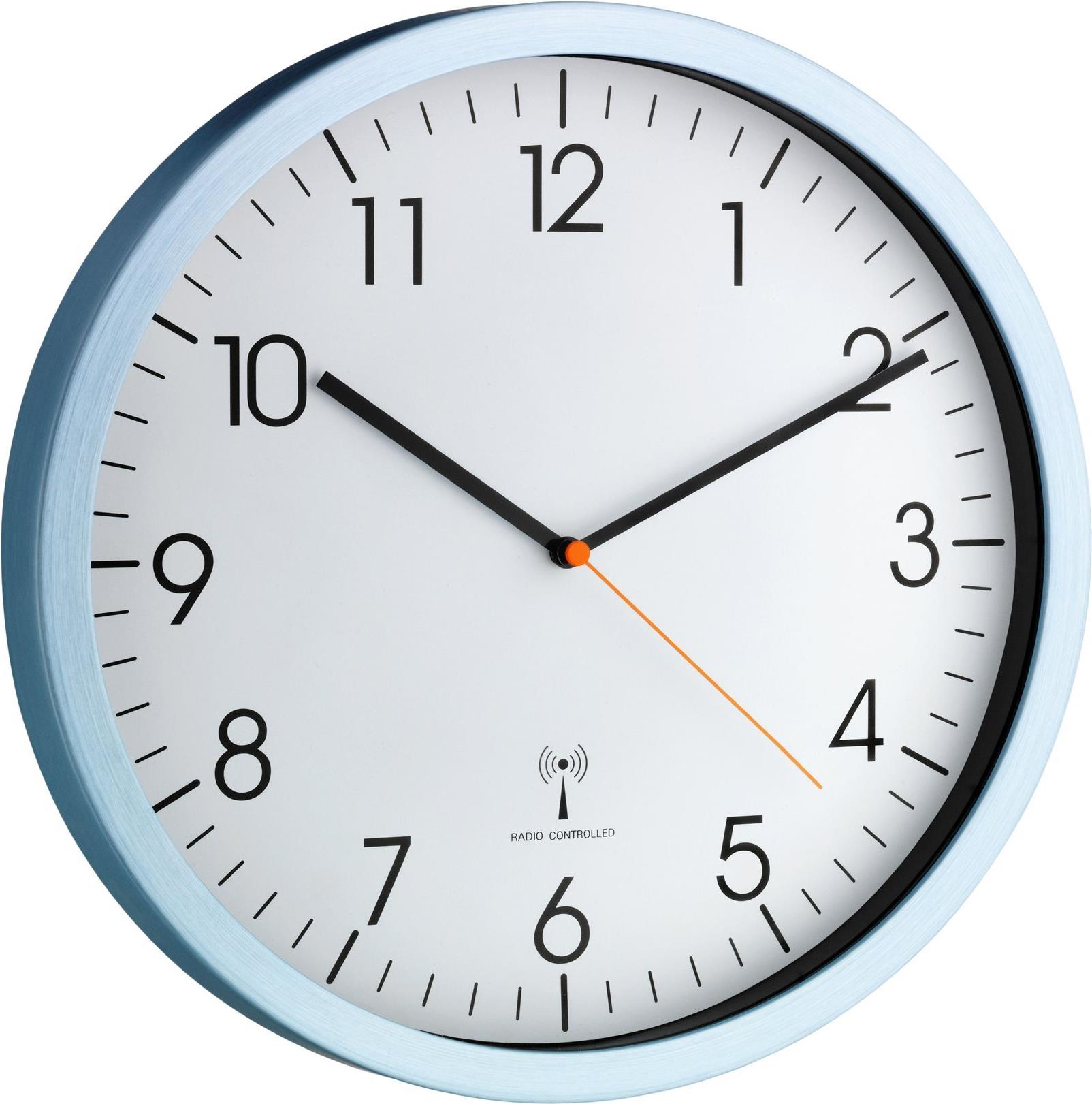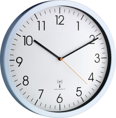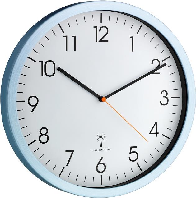 Das klare Design dieser Wanduhr fügt sich harmonisch in jede Umgebung ein. Der hellblaue Rahmen aus gebürstetem Aluminium gibt einen modernen Touch. Die Uhr hat eine wertige Echtglasabdeckung. Die TFA Funk-Wanduhr empfängt die Uhrzeit über das DCF 77 Signal. Damit wird die aktuelle Uhrzeit stets auf die Sekunde genau angezeigt und es entfällt die Umstellung von Sommer- auf Winterzeit. Das innovative "Sweep" Uhrwerk reduziert das Ticken der Uhr auf ein Minimum und arbeitet nahezu geräuschlos. Bei schwacher Batterie bleibt der Sekundenzeiger stehen. Das spart Energie und Sie wissen sofort, wenn es Zeit wird, die Batterie zu tauschen.