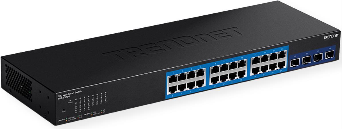 Der 28-Port Web Smart Switch von TRENDnet, Modell TEG-30284, verfügt über 24 Gigabit Ports und vier 10G SFP+ Slots und ist ein kostengünstiger Switch für Hochgeschwindigkeits-Servernetzwerkverbindungen (Uplink oder Downlink). Eine praktische webbasierte Verwaltungsoberfläche bietet Funktionen für Verkehrskontrolle, Fehlersuche, Zugriffskontrolle und Überwachung für flexible Integration in ein SMB-Netzwerk.