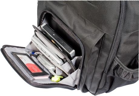 Der 15,6" Corporate Traveler Rucksack ist für unterwegs ideal. Der Rucksack kann mit dem versteckten Trolley-Gurt problemlos am Rollgepäck befestigt werden. Mit dem ausklappbaren Fach für Büromaterial hat man jederzeit Zugriff auf Stifte, Stylus, Visitenkarten und Gerätezubehör. In den weich gefütterten Vordertaschen sind kleine Dinge sicher untergebracht. Der Rucksack hat zudem ein spezielles Aktenfach mit Trennwand und Netztaschen für die Aufbewahrung der Stromversorgung. Mit den beiden Flaschenhaltern sind Kaffee oder Wasser immer in Reichweite. Das strapazierfähige ballistische Nylon in Militärqualität und ein hochmodernes SafePort x D3O-Schutzsystem helfen, Sturz- und Seitenaufprallschäden zu vermeiden und sorgen für zuverlässigen Geräteschutz. Der wasserabweisende Boden sorgt für Stabilität und Standfestigkeit. Das geformte Rückenteil mit Airmesh-Polsterung bietet Tragekomfort. Die Hauptlast des Gewichts wird auf die ergonomischen, biegsamen Schultergurte übertragen.