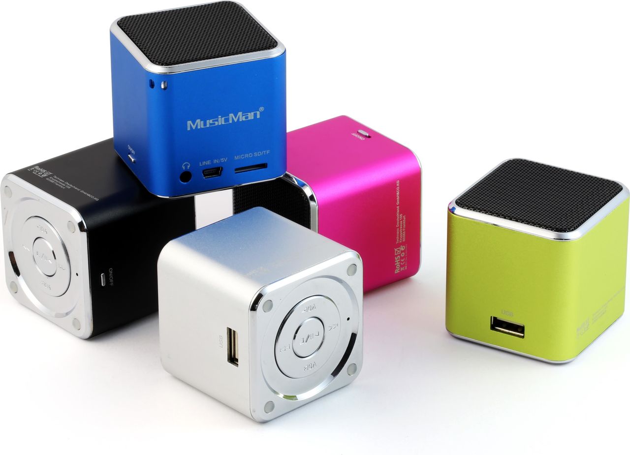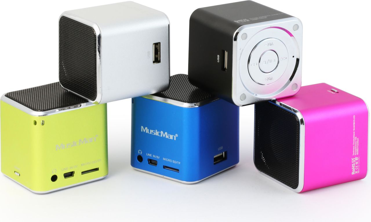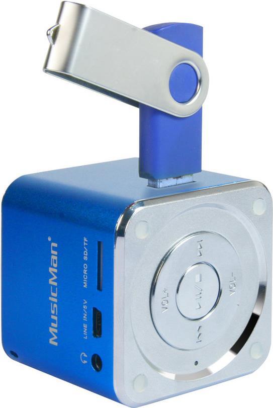 MUSICMAN Mini Soundstation mit hervorragender Sound-Qualität Diese Soundstation aus Aluminium gefertigt. In einem trendigen, modernen Design. Mit blau beleuchtetem Standfuß. Micro SD Karte einstecken und Ihre Musik ...