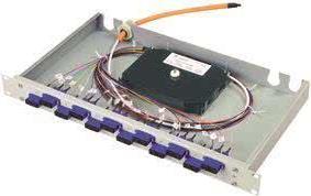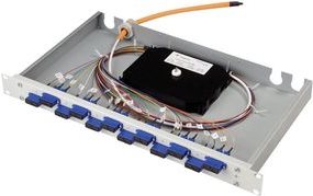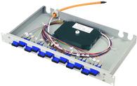 Telegärtner 19\" LWL Patch Panel Basis eco mit 12 x ST Duplex Kupplungen und 12 x ST-Pigtails, 50/125, OM2, Multi- mode, 12 Adernfarben nach DIN VDE 0888, spleißfertig abge- setzt, 700 mm, 1 HE Einbauhöhe, Stecker in Kupplung einge- steckt, Gehäuse und Deckel aus verzinktem Stahlblech, Front Aluminium in lichtgrau (RAL 7035) (H02030B9000)