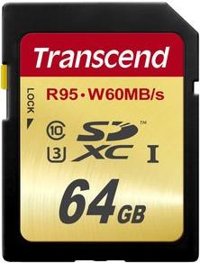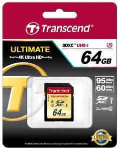 Transcend SDXC I, U3, Class 10 mit Lese 95 und Schreibgeschwindigkeit 60MB/s und einer Kapazität von 64 GB.
