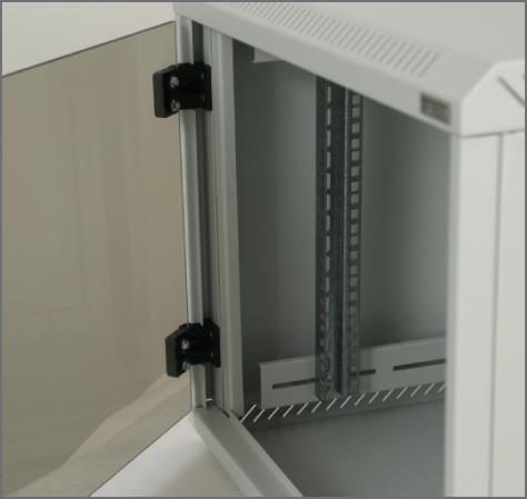 Die 19"-Komponenten werden an den vertikalen Montageschienen installiert, die je nach Bedarf in der Tiefe des Verteilers stufenlos verstellt werden können. Dank der Perforation wird eine natürliche Luftzirkulation und Kühlung der Komponenten gewährleistet.