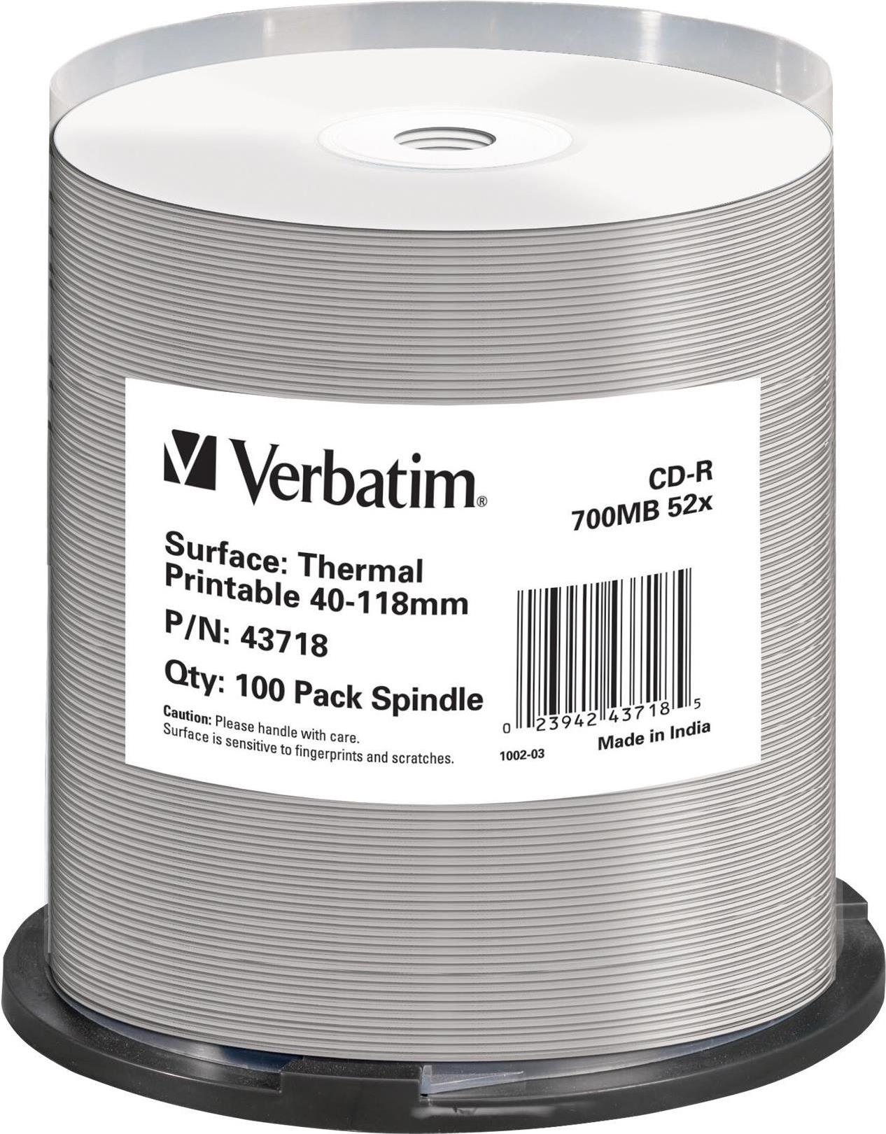 Verbatim - 100 x CD-R - 700MB 52x - breite bedruckbare Oberfläche, bedruckbare Fläche für Thermo-Retransfer - Spindel (43718)