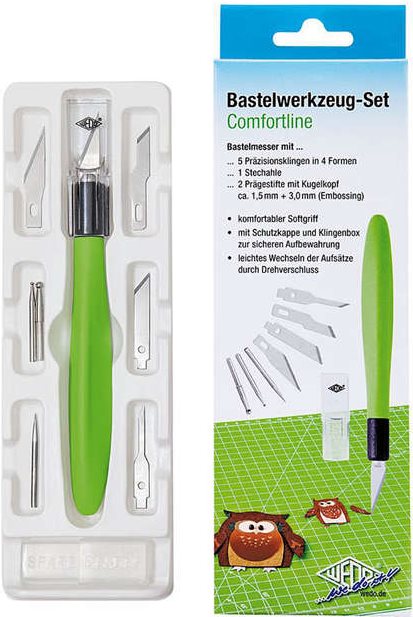 Das kompakte Werkzeug-Set für alle Bastel-Fans umfasst ein Bastelmesser mit 5 Präzisionsklingen in 4 Formen, 1 Stechahle und 2 Prägestifte mit Kugelkopf (ca. 1,5 und 3.0 mm) für die Embossing-Prägetechnik. Die ...