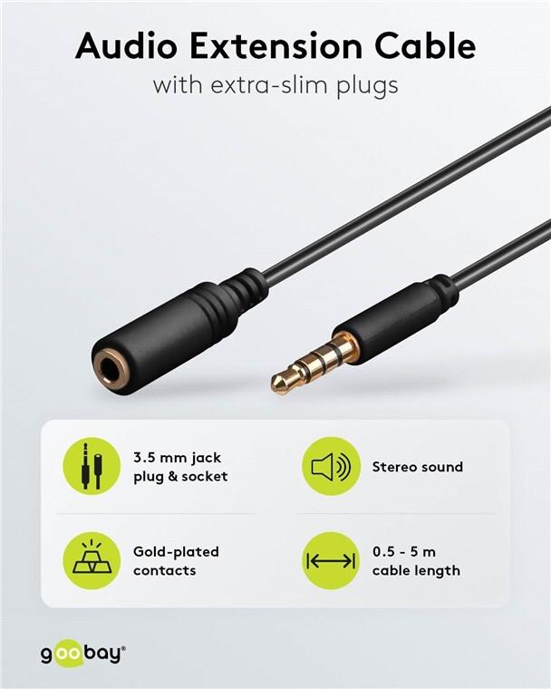 Wentronic Goobay 3,5mm-Klinke-Verlängerungskabel, Schwarz, 0.5 m - Klinke 3,5 mm-Stecker (4-Pin, Stereo) > Klinke 3,5 mm-Buchse (4-Pin, Stereo) (62476)