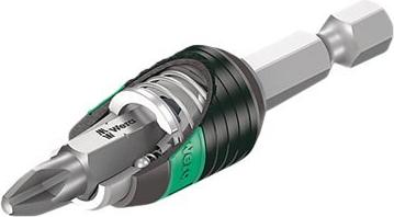 Bits mit winzigen Diamantpartikeln auf der Bitspitze. Diese sorgen für sicheren Sitz in der Schraube, reduzieren den benötigten Anpressdruck und reduzieren die Gefahr des Abrutschens. BiTorsion Bits mit elastischer Torsionszone, in die bei Belastungsspitzen kinetische Energie abgeleitet wird. Mit weicherer Bi-Torsionzone zur Vermeidung des Verwindens der Bit-Spitze bei hohen Belastungen. Dadurch signifikante Erhöhung der Produktlebensdauer. Ausgestattet mit Rapidaptor-Technologie, die die Aufnahme der Bits auch ohne Betätigung der Hülse erlaubt. Die Entnahme des Bits geschieht durch einfaches Nach-vorn-Schieben - für blitzschnellen Bitwechsel, auch mit nur einer Hand. Zur Aufnahme in die Schraubermaschine oder zum Einsatz in das Futter der elektronischen Bohrmaschine. Der mehrkomponentige Bit-Check überzeugt durch geringes Gewicht und größtmögliche Kompaktheit. Dabei sorgt das Softmaterial im Unterteil des Bit-Checks für die sichere Klemmung der Bits und gleichzeitige leichte Entnehmbarkeit. Profil und Größe der Bits sind durch den Wera Werkzeugfinder "Take it easy" mit seiner Farbcodierung und gut sichtbaren Beschriftung leicht erkennbar.