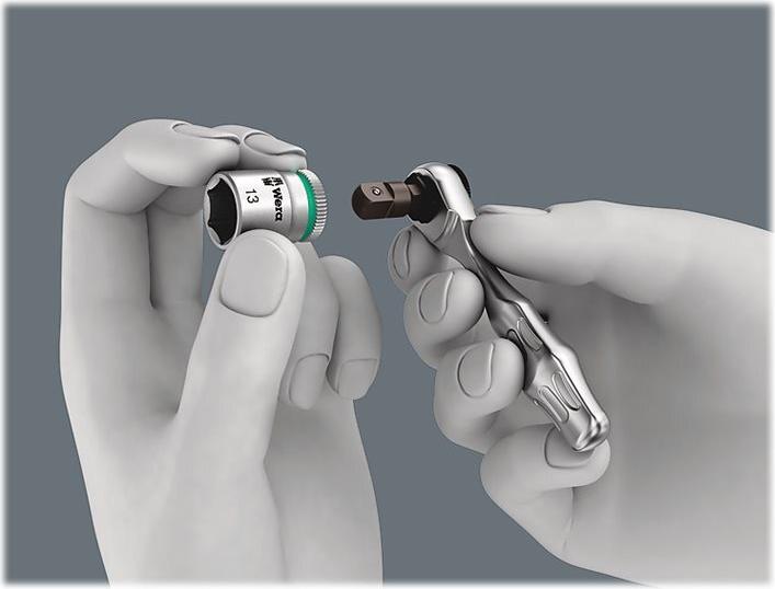 Ratschen und Schrauben im Kraftform Kompakt Format. Diese gesenkgeschmiedeten Ratschen Zyklop Mini 1 und 2 in Vollstahlausführung kombinieren filigranes Design mit einer unglaublichen Robustheit. Zum besonders schnellen Schrauben auch in engen Arbeitssituationen. Immer dann, wenn das Verschrauben per Maschine oder herkömmlichem Handwerkzeug aus Platzgründen nicht möglich ist, kommen Zyklop Mini 1 oder Zyklop Mini 2 zum Einsatz. 1 Bit-Ratsche Zyklop Mini 1; geeignet für die Aufnahme von Bits mit 1/4"-Außensechskantantrieb nach DIN ISO 1173-C 6,3 und E 6,3 und Wera Anschluss-Reihen 1 und 4; über Adaptierung mit Wera Adapter 870/1 ist auch der Einsatz von 1/4"-Nüssen möglich. 1 Nuss-Ratsche Zyklop Mini 2; geeignet für die direkte Aufnahme der Wera Zyklop Spezialnüsse 8790 FA.