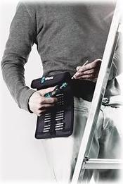 Falttasche mit 89 mm langen Bits. Inklusive Handhalter 816 R Kraftform mit Schnellwechselfutter "Rapidaptor" und mehrkomponentigem Kraftform-Griff für ermüdungsarmes Arbeiten. Harte Griffzonen für hohe Arbeitsgeschwindigkeit, während weiche Griffzonen hohe Drehmomentübertragung garantieren. Für hand- und maschinenbetätigte Verschraubungen geeignet.