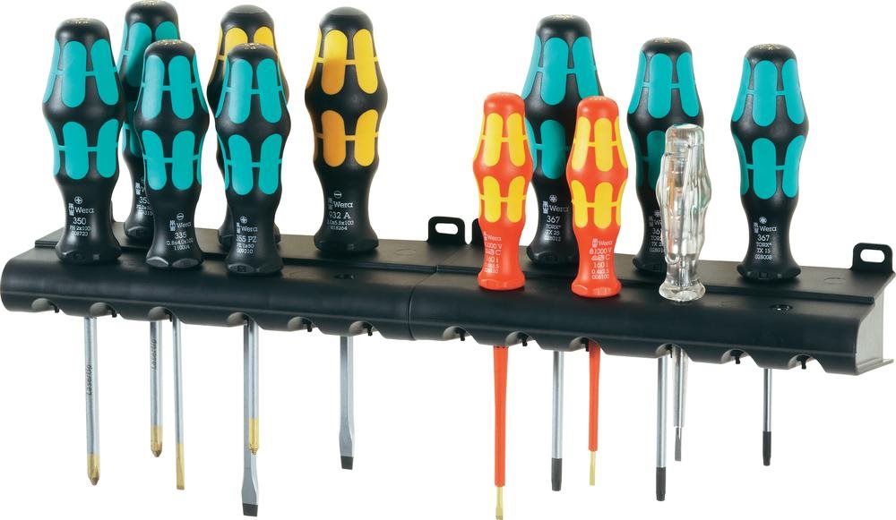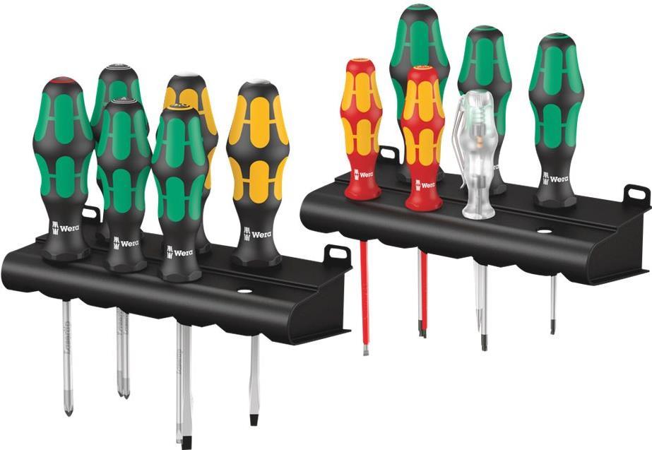 12-teiliges Schraubendreher Allround-Set. Kraftform Plus Griff für angenehm ergonomisches Arbeiten, bei dem Blasen und Schwielen vermieden werden. Harte Griffzonen für hohe Arbeitsgeschwindigkeit, während weiche Griffzonen hohe Drehmomentübertragung garantieren. Teilweise mit Lasertip: Die Spitze von Wera Lasertip-Schraubendrehern wird mit Laserstrahlen mikroskopisch fein aufgeraut. Diese raue Oberfläche "beißt" sich förmlich im Schraubenkopf fest. Das unbeabsichtigte Herausrutschen gehört der Vergangenheit an. "Take it easy" Werkzeugfinder mit Farbkennzeichnung nach Profilen und Größenstempelung - zum einfachen und schnellen Finden des benötigten Werkzeugs.