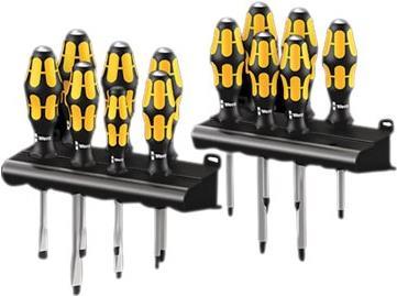 Wera Schraubmeißel-Satz zum Schrauben, Meißeln, Stemmen und Lösen festsitzender Schrauben. Mit mehrkomponentigem Kraftform-Griff für schnelles und schonendes Arbeiten: Harte Griffzonen für hohe Arbeitsgeschwindigkeit, weiche Griffzonen für hohe Drehmomentübertragung. Mit durchgehender Sechskantklinge aus hochwertigem Bit-Material, dadurch verlustfreie Kraftübertragung auch bei Hammerschlägen. Zähhart vergütetes Material gegen Absplittern oder Bruch der Klinge. Mit integrierter Schlagkappe zur Erhöhung der Lebensdauer und Reduzierung der Splittergefahr. Über die integrierte Sechskantschlüsselhilfe können mit Maul- oder Ringschlüsseln höhere Drehmomente übertragen werden. Die Wera Black Point Spitze und ein aufwändiges Härteverfahren garantieren lange Nutzbarkeit der Spitze, erhöhten Korrosionsschutz und exakte Passgenauigkeit. Mit Sechskantabrollschutz gegen lästiges Wegrollen am Arbeitsplatz. Mit Profilgrößenkennzeichnung auf dem Griff zum leichteren Finden und Sortieren des Werkzeugs. Alle gängigen Schraubprofile in einem Satz. Mit2Aufbewahrungs-Racks, die für Ordnung sorgen.