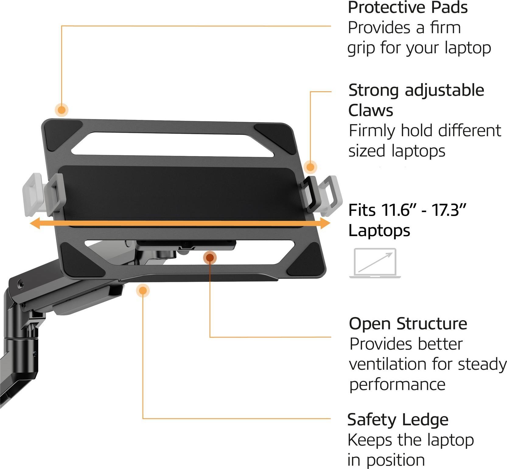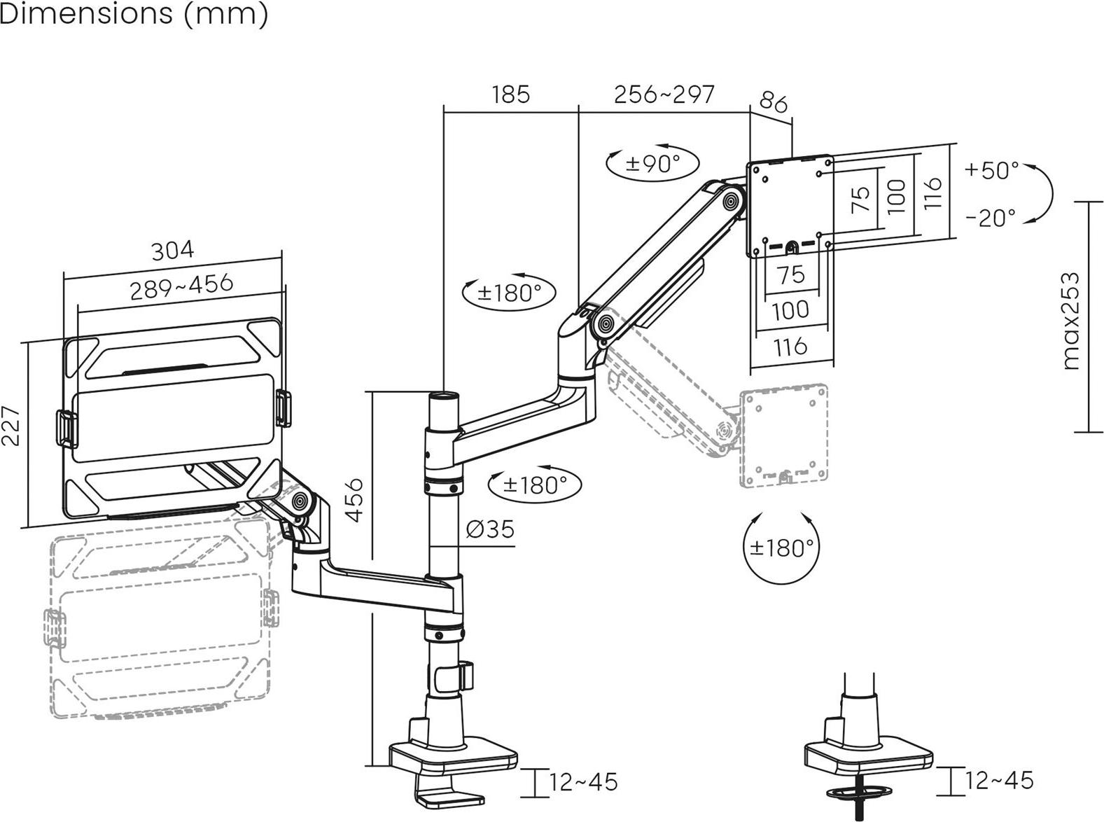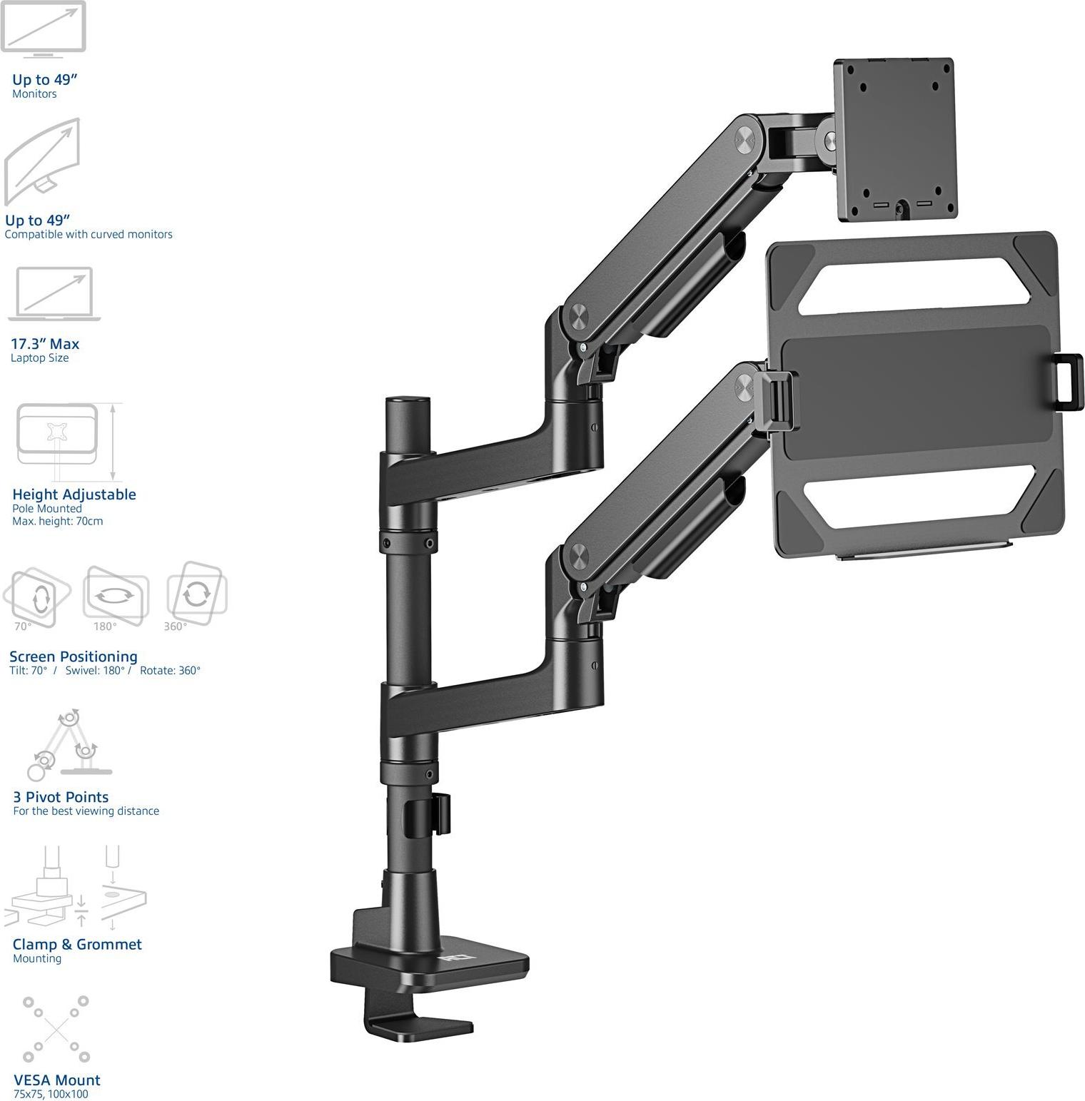 Verbessern Sie Ihren Arbeitsplatz mit dem ACT AC8341-Montageset, das für LCD-Displays und Notebooks konzipiert wurde. Dieses vielseitige Set unterstützt Displaygrößen von 17 bis 49 Zoll und bietet Platz für Notebooks mit einer Größe von bis zu 17,3 Zoll, wodurch Flexibilität für verschiedene Aufstellungen gewährleistet ist. Es besteht aus Kunststoff, Aluminium und Stahl und gewährleistet Langlebigkeit bei gleichzeitig geringem Gewicht. Das Montageset verfügt über ein integriertes Kabelmanagementsystem, das für einen sauberen und organisierten Arbeitsplatz sorgt. Mit der Möglichkeit, den Bildschirm um bis zu 70° zu neigen, um 180° zu schwenken und um 360° zu drehen, können Benutzer den Bildschirm leicht für optimale Blickwinkel einstellen. Die Höhenverstellbarkeit und die Tiefenverstellbarkeit erhöhen den Komfort und die Ergonomie zusätzlich und machen ihn ideal für jeden Benutzer, der nach effizienten Arbeitsplatzlösungen sucht.