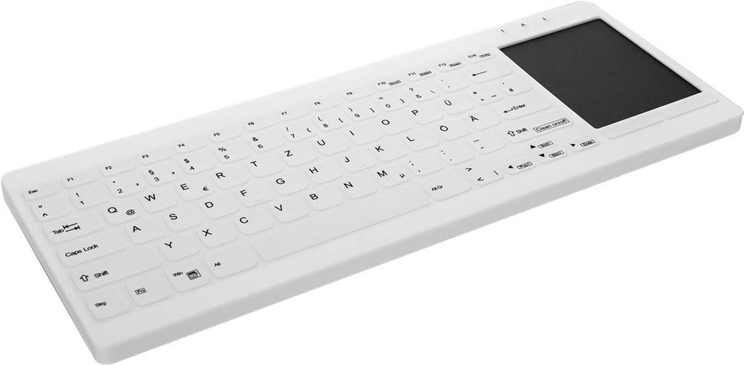 Die AK-C4412 ist eine desinfizierbare, kompakte, ultraflache Hygiene- und Medizin-Tastatur mit integriertem Touchpad. Das Tastenfeld wird durch eine Silikonmembran geschützt, die das Eindringen von Schmutz und Flüssigkeiten verhindert. Die Silikontastenmembran mit ultraflachem Tastenprofil und geschlossener, spaltfreier Oberfläche bietet wirksamen Schutz gegen Kreuzkontamination, Keimverschleppung und Ausbildung von Biofilmen.
