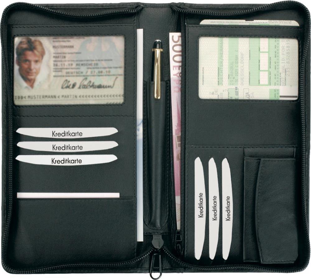 Umlaufender Reißverschluss, Klarsichteinschubfach für Bordkarte auf der Rückseite. Fächer für: Personalausweis/Führerschein, Reisepass, sieben Visiten- bzw. Kreditkartenfächer, Kugelschreiberschlaufe, Klarsichtfach ...