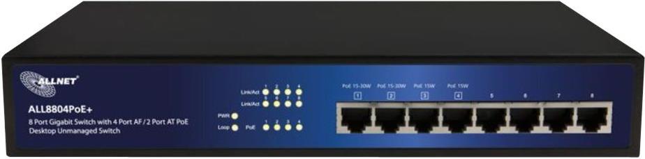 ALLNET ALL8804POE+ - IEEE 802.1p - IEEE 802.3 - IEEE 802.3af - IEEE 802.3at - IEEE 802.3u - IEEE 802.3x - L2 - Gigabit Ethernet (10/100/1000) - Schwarz - Blau - 50/60 Hz - RJ-45 (ALL8804PoE+)