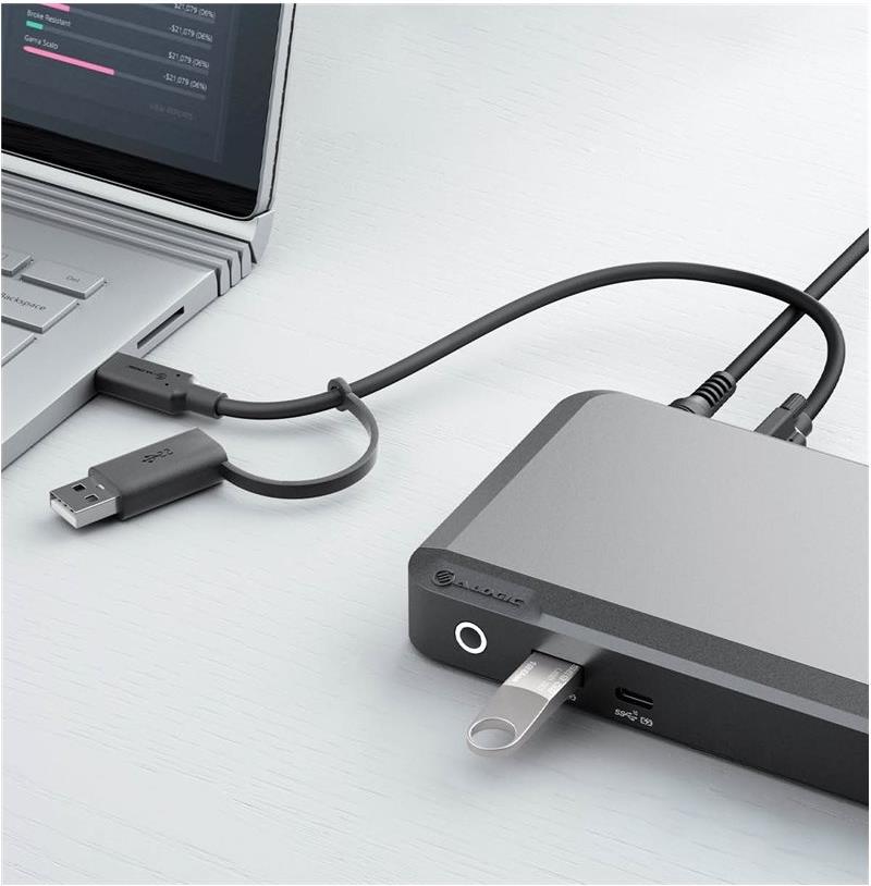 Die DX2 ist eine robuste Dockingstation mit einer glatten Metalloberfläche in den eleganten Farben Spacegrau und Schwarz. Dank ihrer hochwertigen Designmerkmale und Ästhetik passt sie perfekt auf jeden Schreibtisch.