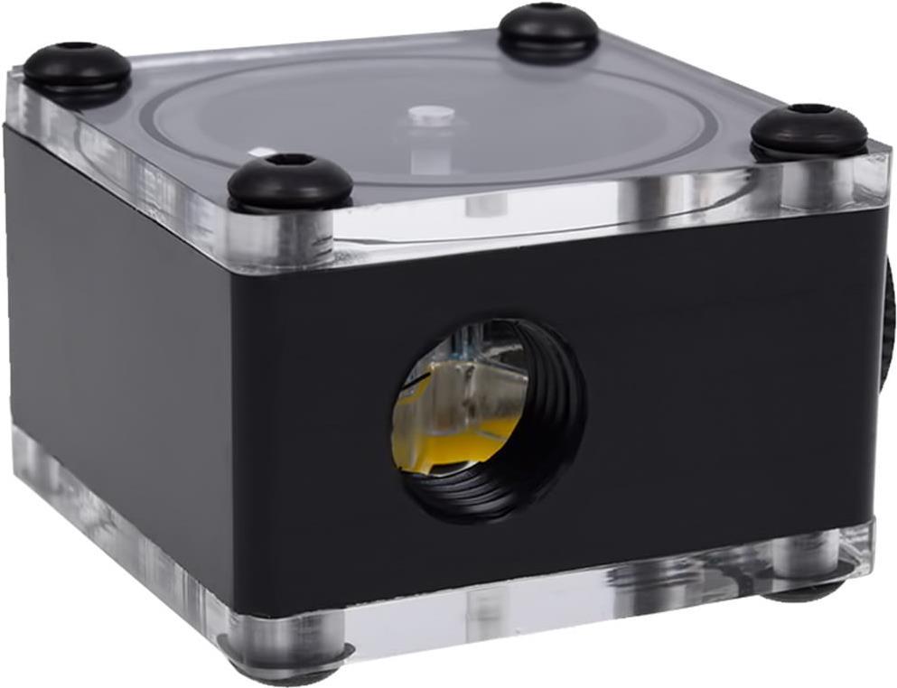Die Kombination aus Acetal und Plexiglas ist eine gelungene Kombination die sich nahtlos in jedes System einfügt. Außer den zwei 1/4" Gewinden die für das durchfließen des Wassers notwendig sind, hat der Alphacool Eisflügel ein weiteres Gewinde an der Oberseite welches für viele Zwecke genutzt werden kann: Beleuchtung, Fillport, Drainport oder auch als Winkelstück - die Funktion ist auch gewährleistet wenn das obere Gewinde als Auslass genutzt wird.