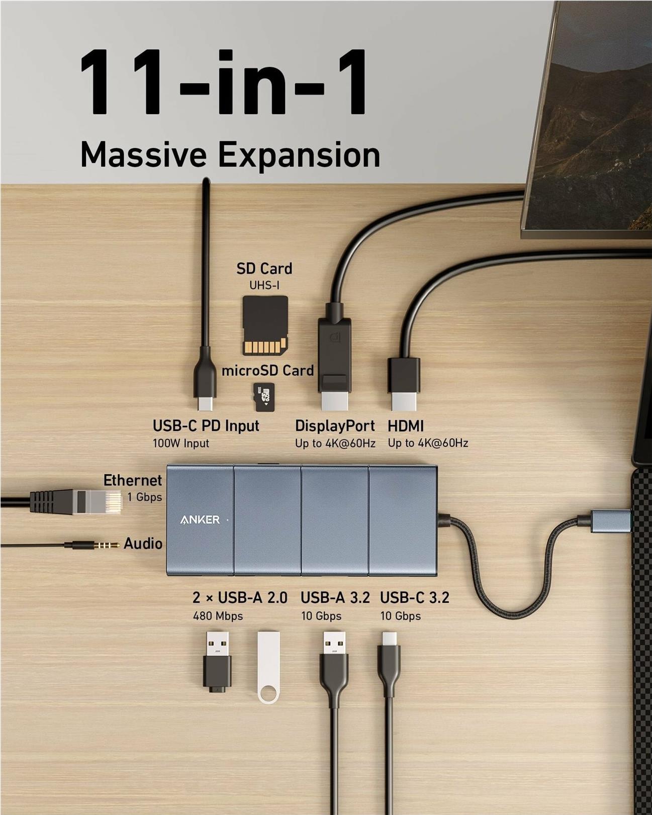 Die Anker 565 Dockingstation ist eine umfassende Lösung zur Erweiterung der Konnektivität Ihres Geräts. Sie wurde entwickelt, um den Anforderungen eines modernen Arbeitsplatzes gerecht zu werden, und verfügt über ein integriertes USB-C-Kabel mit Power Delivery, um Ihre Geräte zu laden und gleichzeitig die Datenübertragung zu unterstützen. Mit zusätzlichen Anschlüssen wie USB-A 2.0, USB-A 3.2 und einem dedizierten Ethernet 1000Base-T-Anschluss stellt er sicher, dass Sie immer verbunden sind, ob mit Peripheriegeräten oder dem Internet. Der Anker 565 bietet auch Unterstützung für hohe Auflösungen und ist in der Lage, 4K-Videos mit 60 Hz sowohl über HDMI- als auch DisplayPort-Ausgänge zu übertragen. Bei dieser Anschlusserweiterung geht es nicht nur um Konnektivität, sondern darum, Ihre Produktivität und Ihr Multimedia-Erlebnis ohne Kompromisse zu verbessern.