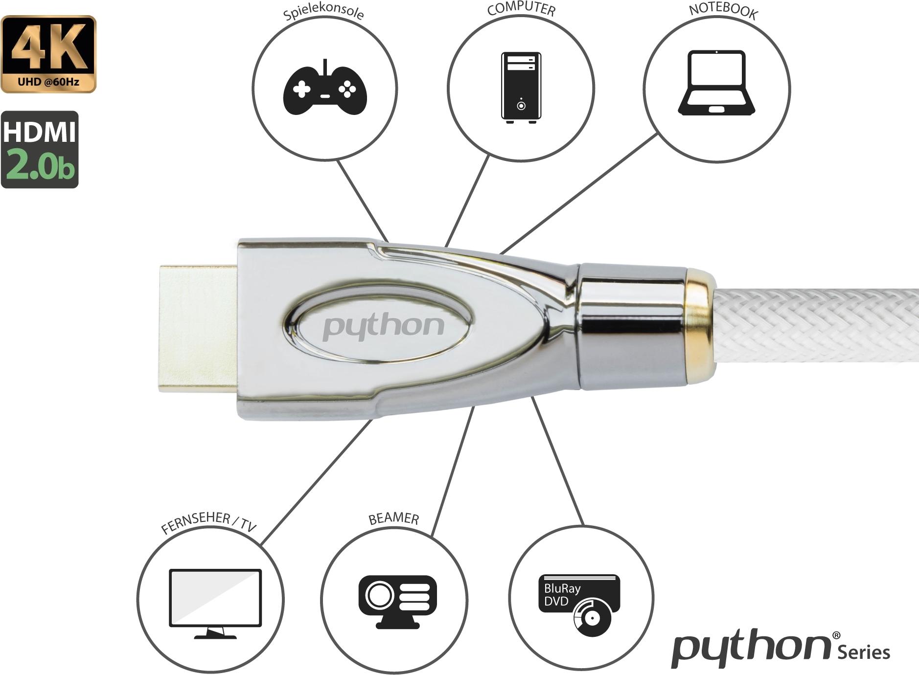Anschlusskabel HDMI® 2.0 Kabel 4K2K / UHD 60Hz, 24K vergoldete Kontakte, OFC, Nylongeflecht weiß, 1m, PYTHON® Series (GC-M0161)