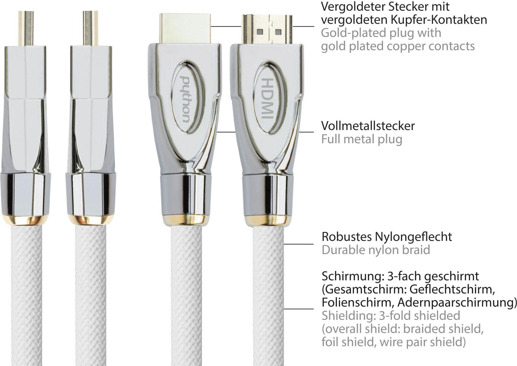 Anschlusskabel HDMI® 2.0 Kabel 4K2K / UHD 60Hz, 24K vergoldete Kontakte, OFC, Nylongeflecht weiß, 5m, PYTHON® Series (GC-M0165)