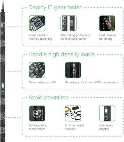 APC NetShelter Rack PDU Advanced bietet eine zuverlässige Stromverteilung für IT-Geräte in Server- und/oder Netzwerk-Racks. Leistungsmessung auf PDU-Ebene über Fernzugriff und lokales Display für Transparenz und Benachrichtigung bei möglicher Überlast. 4-in-1-Kombinationssteckdosen, die entweder als C13-, C19-, C15- oder C21-Ausgänge verwendet werden können, bieten eine unvergleichliche Flexibilität bei der Bereitstellung. Maximale Ausgangsdichte mit 42 Ausgängen in einem 2,2" breiten Formfaktor. Die Ausgänge der PDUs sind farbcodiert und/oder bei 3-Phasen-Modellen nach Unterbrecher und Eingangsphase gekennzeichnet, um die Bereitstellung zu vereinfachen. Bietet ein alternierendes Phasendesign, bei dem jede der 3 Phasen in kleinen Steckdosengruppen organisiert ist, die sich von oben nach unten in der PDU abwechseln, um eine bessere Verwaltung der Stromkabel zu ermöglichen und eine bessere Lastverteilung zu fördern. Dank Power Sharing können PDUs über 2 Ethernet-Ports kaskadiert werden, so dass eine Netzwerkmanagementkarte auch bei einem Stromausfall weiter funktioniert. Keine Unterbrechung der Netzwerkkommunikation, des Sensorbetriebs und der Alarmtraps. Live Swap Netzwerkmanagement-Karte (NMC), die ausgetauscht werden kann, ohne dass die PDU oder die angeschlossenen Geräte ausgeschaltet werden müssen, um die Ausfallzeit im unwahrscheinlichen Fall eines NMC-Stromausfalls zu minimieren. Sie sind für einen Betrieb bis zu 60°C bei Volllast ausgelegt und zugelassen und gewährleisten Zuverlässigkeit und Verfügbarkeit auch bei den heutigen hochdichten Installationen. Gigabit-Ethernet zur Verbesserung und Standardisierung der Netzwerkkonnektivität für alle Anlagen im Rechenzentrum. Ein zweiter Ethernet-Port (10/100) steht zur Verfügung, um eine Kaskadierung mit anderen PDUs zu ermöglichen, eine Verbindung zu einem zweiten privaten Netzwerk herzustellen oder eine Netzwerkredundanz bereitzustellen. Die Messgenauigkeit von 1 % gibt Ihnen die Gewissheit, dass Sie mit NetShelter Rack PDU Advanced eine verbrauchsabhängige Abrechnung vornehmen können. Darüber hinaus gewährleistet die höhere Genauigkeit genaueste Messungen für die Kapazitätsplanung und die Überwachung von Alarmschwellen. Zwei Anschlüsse für Umgebungssensoren ermöglichen den Anschluss von optionalen Sensoren (separat erhältlich). Für den Einsatz in Rechenzentren in mehreren Regionen sind diese PDUs sowohl UL- als auch CE-zertifiziert und bieten eine PDU, die weltweit eingesetzt werden kann, um den Einsatz zu vereinfachen und zu standardisieren.