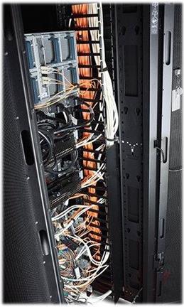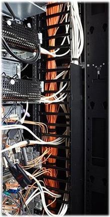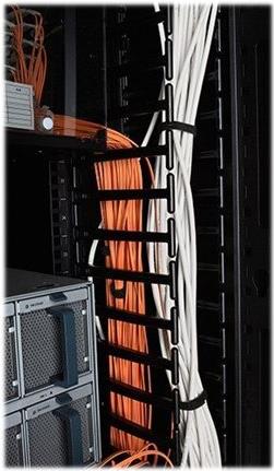 Die vertikalen Kanäle sind mit glatten Kunststofffingern in 1HE-Schritten versehen, damit die Patchkabel geordnet ein- und ausgehen können.
