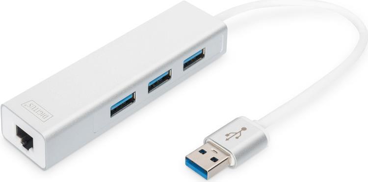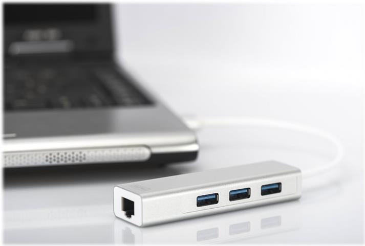 Mit dem DIGITUS® USB 3.0 3-Port Hub & Gigabit LAN-Adapter können Sie 3 zusätzliche USB 3.0 High-Speed Geräte an Ihr Ultrabook, Notebook, Subnotebook, Macbook, Macbook Air, etc. anschließen. Drucker, Festplatten, Flashspeicher, Cardreader, Lautsprecher und viele weitere Geräte lassen sich einfach über das USB-Interface anschließen. Zusätzlich erweitert der Adapter Ihren Computer um einen Gigabit-Ethernet-Port und macht ihn somit netzwerkfähig, da viele mobile Geräte heutzutage nur noch über Wireless LAN ins Netzwerk eingebunden werden können.