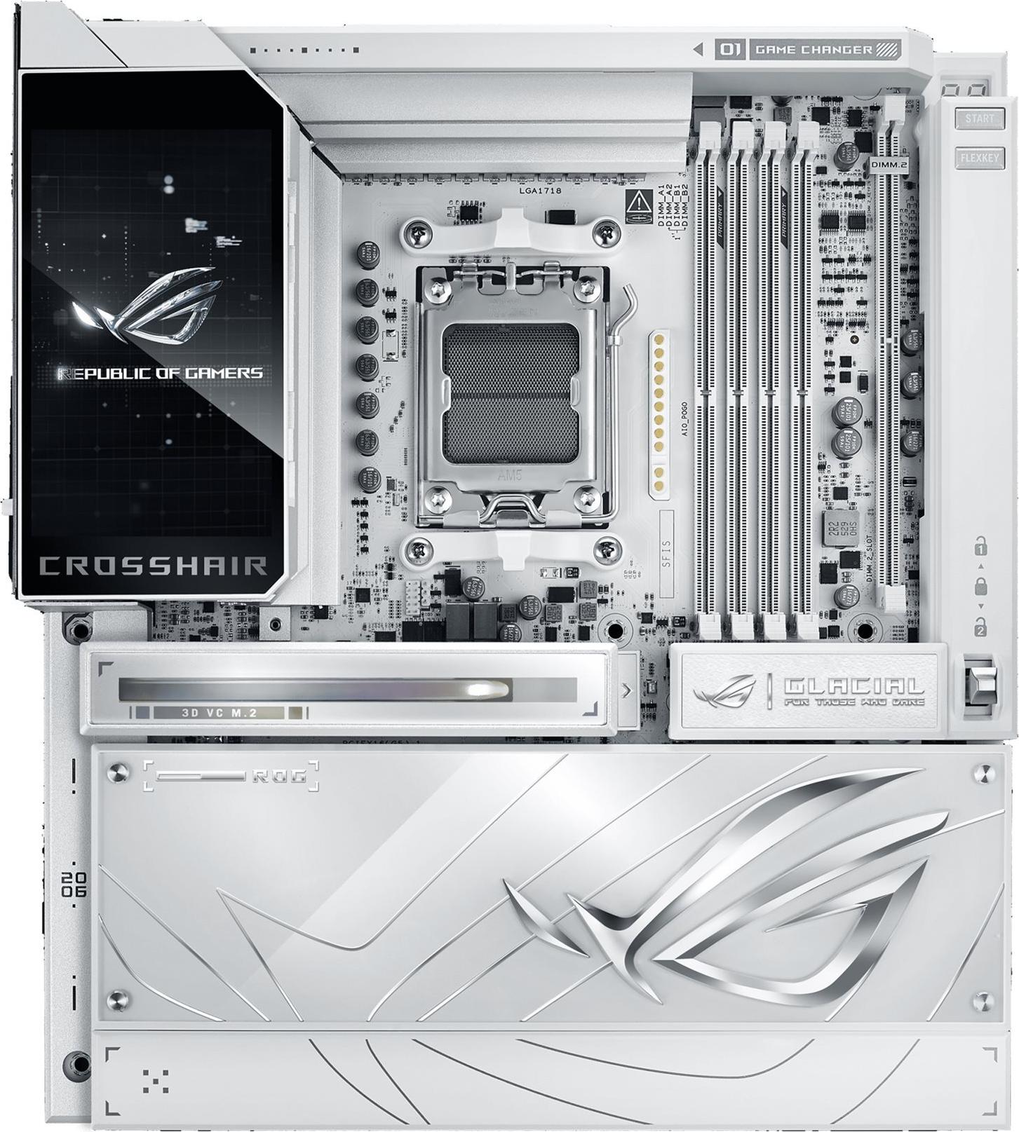 Das ROG CROSSHAIR X870E GLACIAL-Motherboard von ASUS wurde entwickelt, um die Leistung von High-End-Gaming-Systemen zu steigern. Mit Unterstützung für Prozessoren der Serien Ryzen 7000 bis 9000 und schnellem DDR5-RAM sorgt es für optimale Verarbeitungsleistung. Das Motherboard zeichnet sich durch ein robustes Design mit einem geräumigen erweiterten ATX-Formfaktor und mehreren Erweiterungssteckplätzen aus, die eine Anpassung und Erweiterung für unterschiedliche Benutzeranforderungen ermöglichen.