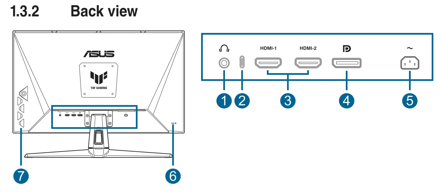1x DisplayPort 1.4 (300Hz@2560x1440), 2x HDMI 2.1 (300Hz@2560x1440), 1x USB-C (Service Anschluss), 1x 3.5mm Klinke Line-Out, 1x AC-In C14 (Netzanschluss) |
