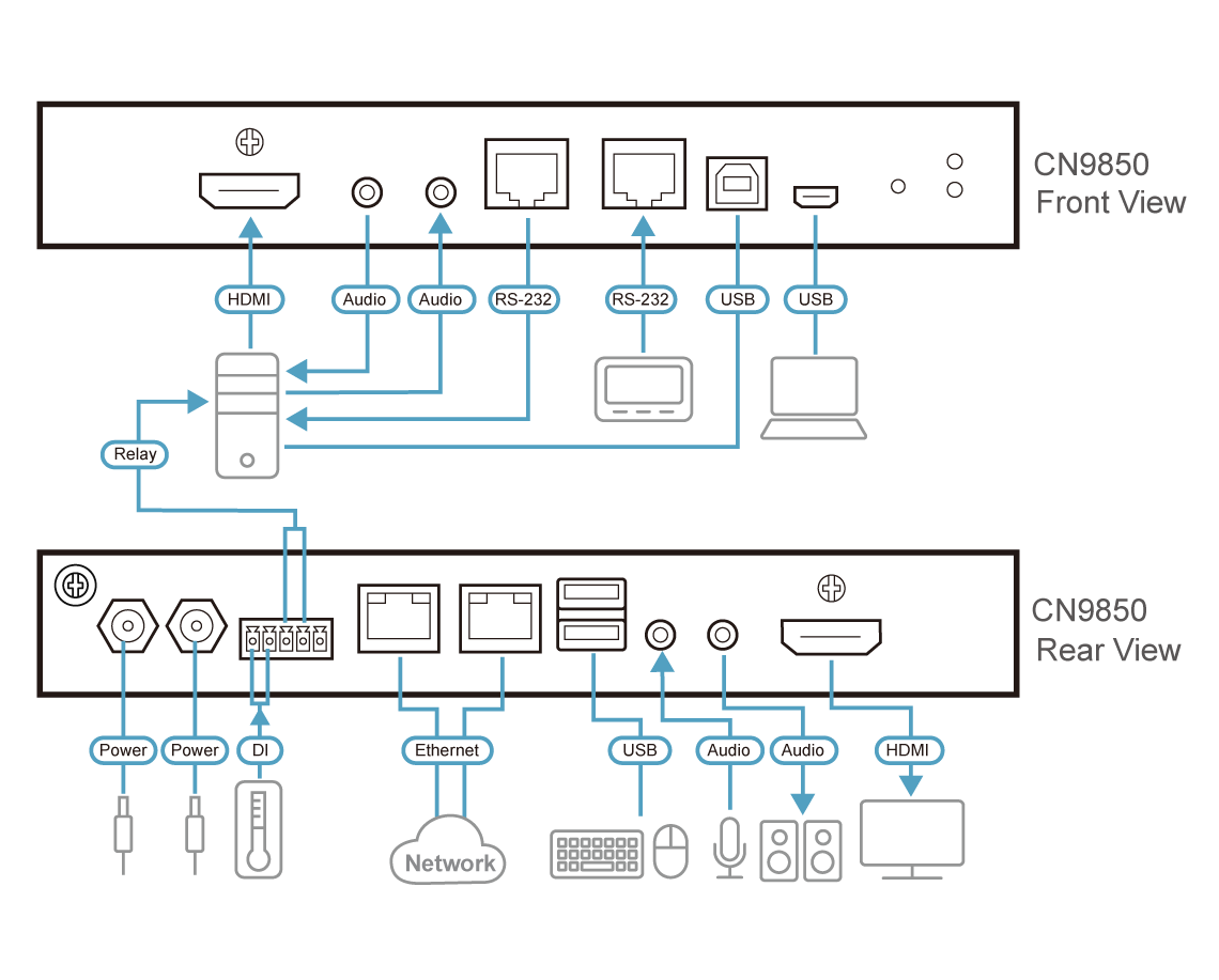 | Schnittstellen | 2 x Konsole (USB) Type A 1 x HDMI Konsole 1 x Mikrofon Mini-Klinkenstecker Konsole 1 x Audioeingang Mini-Klinkenstecker Konsole 1 x USB Type B 1 x HDMI 1 x Mikrofon Mini-Klinkenstecker 1 x Audioeingang Mini-Klinkenstecker 2 x 10/100/1000 Base-T RJ-45 2 x seriell RJ-45 1 x Konsole mini-USB LUC |