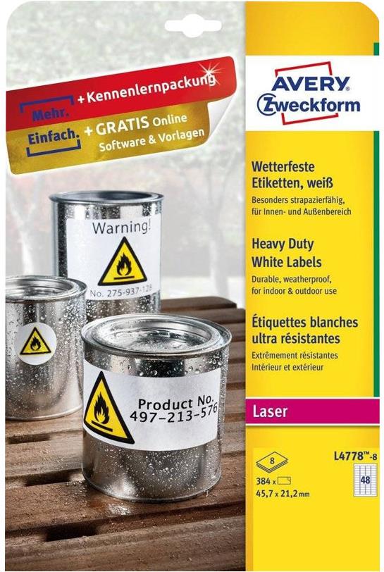 Kein Problem wenn es mal härter wird: Die wetterfesten Etiketten von Avery Zweckform. Die beschichteten, weißen Folienetiketten im Format 45,7x21,2mm sind deutlich strapazierfähiger als herkömmliche Papieretiketten. Durch Ihre starke Haftung eignen sie sich zur sicheren und dauerhaften Kennzeichnung sogar draußen bei Wind und Wetter wie z.B. bei Lagerhaltung im Außenbereich. Denn sie sind öl- und schmutzbeständig, resistent gegen UV-Strahlung, temperaturbeständig (-20°C bis +80°C) und wasser- und reißfest.