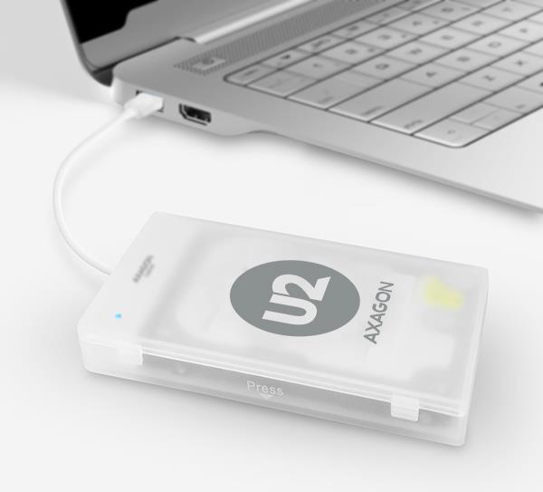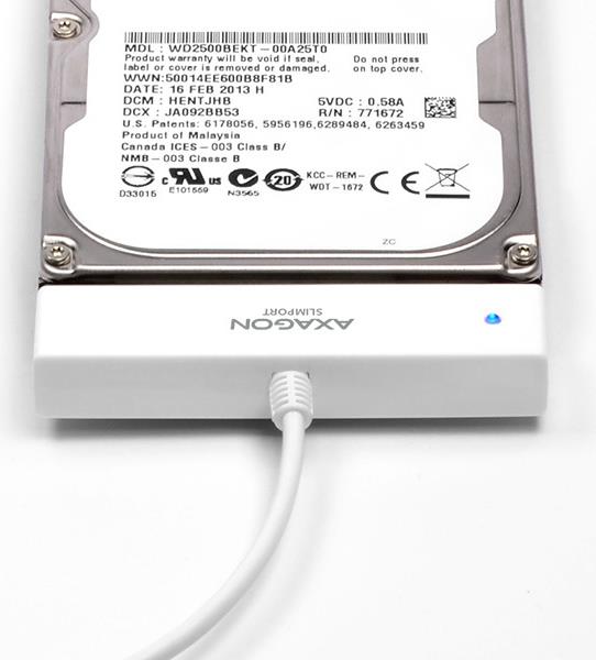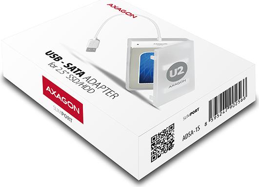 Kompakter Adapter AXAGON ADSA-1S SLIMport mit USB 2.0 Schnittstelle, für einfachen Anschluss von einer 2.5"-SATA-Festplatte bestimmt.