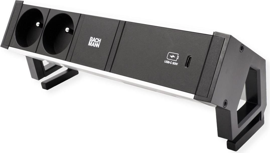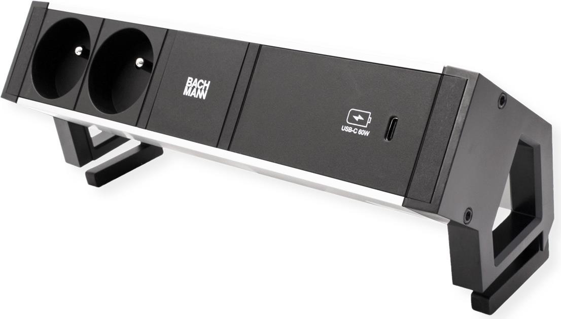 Bachmann DESK2 ALU BLACK Steckdoseneinheit mit erhöhtem Berührungsschutz 2xUTE 35° Steckdosen, schwarz 1xUSB C 60W Charger Zuleitung 0,2m H05VV-F3G1,5mm² schwarz mit GST18i3 Stecker Profil: Aluminium eloxiert (natur) Endkappen: Kunststoff schwarz inkl. Haltewinkel (937.321)