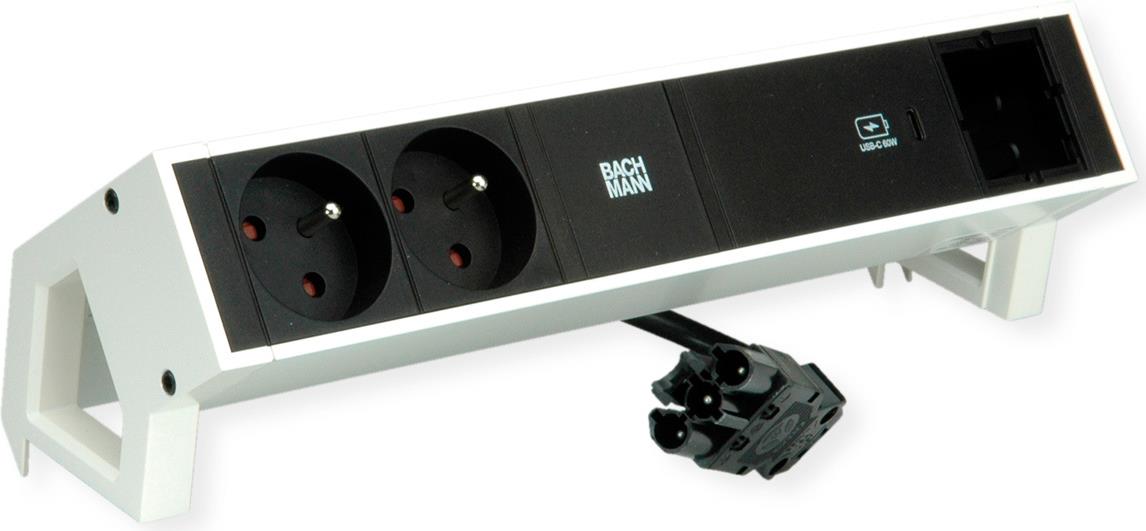 Bachmann DESK2 Steckdosenleiste Farbe weiss, ähnlich RAL9010 mit erhöhtem Berührungsschutz 2xUTE 35° Steckdosen, schwarz 1xUSB C 60W Charger 1xCustom Modul leer Zuleitung 0,2m H05VV-F3G1,5mm² schwarz mit GST18i3 Stecker inkl. Haltewinkel Logo verpackt im (902.955)
