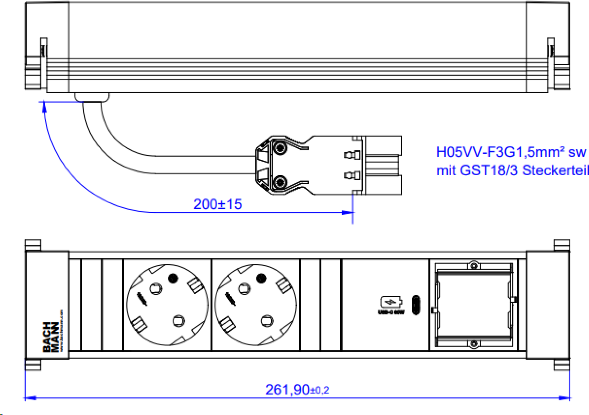 Bachmann Power Frame Steckdosenleiste Medium ALU 2xSchutzkontaktsteckdosen schwarz mit erhöhtem Berührungsschutz 1xUSB C 30W Charger 1xCustom Module leer Stromeingang 0,2m H05VV-F3G1,5mm² mit GST18 Stecker; Zuleitung durch Endkappe Bedruckung Bachmann; Verpackung (916.507)